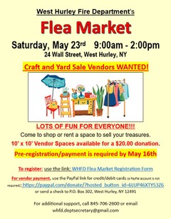 Craft Fair / Flea Market 2026 May 23 @ 9:00 am - 2:00 pm West Hurley Firehouse 24 Wall Street, West Hurley, NY, United States