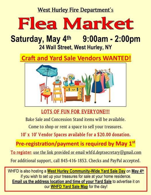 10x10' Vendor spaces for a $20 Donation. Pre registration required, by Sept 5th. Call 845 415 1853 or email WHFD.deptsecretary@gmail.com to register.